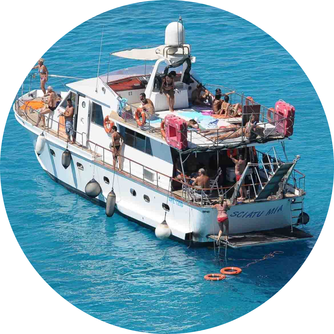 La comodità di uno Yacht di 20mt per 5mt di larghezza con le sue quasi 50 tonnellate di stazza, unite alla professionalità dell'equipe, consentono di raggiungere un altissima qualità nel servizio di escursioni in mare. Sciatumia vi garantisce spazio comodo nel solarium ed anche all'ombra. Vi permette di pranzare al tavolo come al ristorante, di godere di servizi igienici separati uomo/donna comodissimi e di sentirvi come in un gruppo di amici, mai confusione ed affollamento, mai!